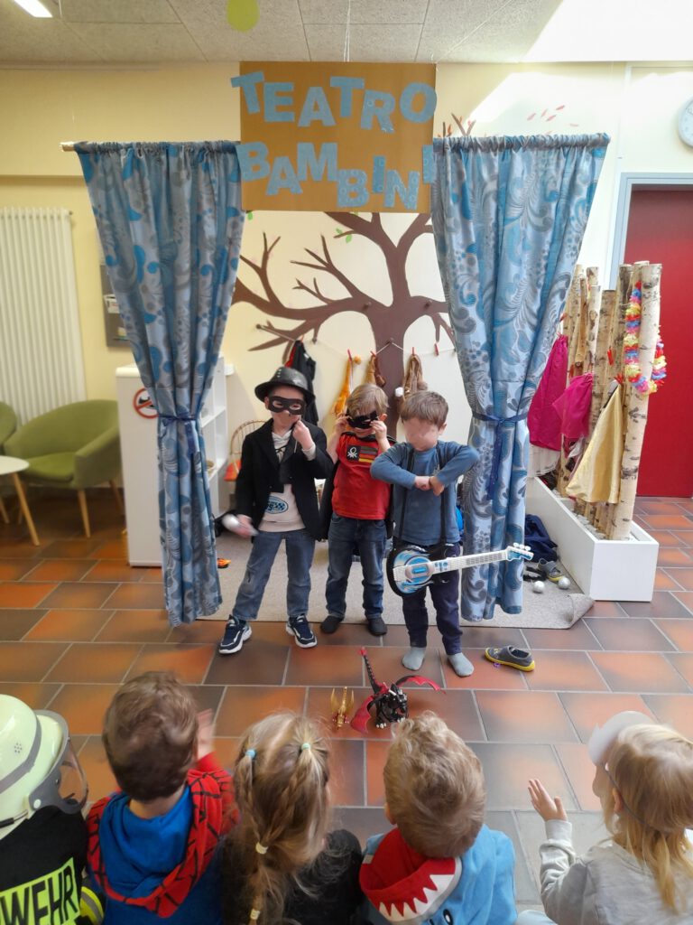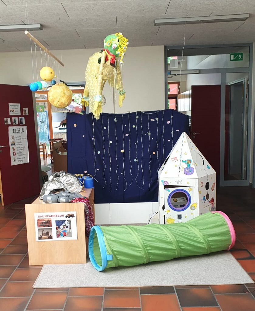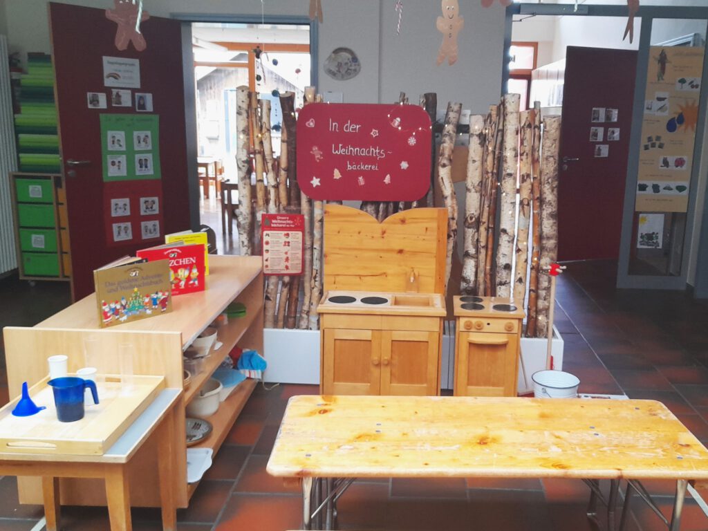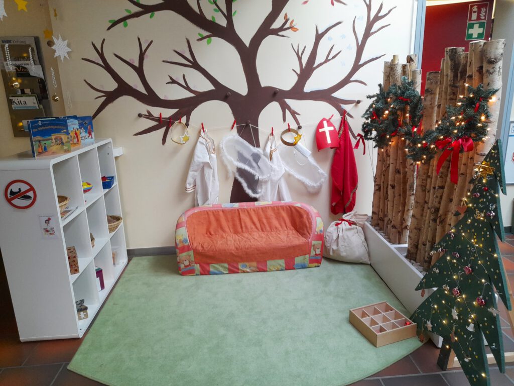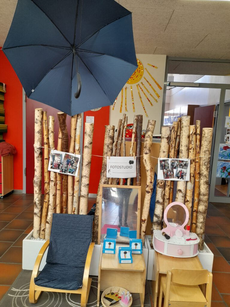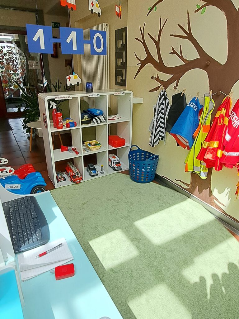 Im Gangbereich, aber auch in jedem der drei Gruppenzimmer werden regelmäßig wechselnde Themenecken zum Spielen angeboten. So gab es z. B. schon einen Reiterhof, eine Baustellen-, Zirkus- und Weltallecke oder auch mal ein Fotostudio. Passend zu den Jahreszeiten werden außerdem verschiedene Frühlings- und Weihnachtsecken gemeinsam mit den Kindern entwickelt und gestaltet. Diese verschiedenen Themen regen vor allem die Sprechfreude der Kinder an und durch die verschiedenen Themen erweitert sich, durch die gemeinsame Erarbeitung, auch der Wortschatz der Kinder. Zusätzlich fördert es die Kreativität und die Sozialkompetenz wenn Kinder aus verschiedenen Gruppen z. B. im Gang gemeinsam spielen.
